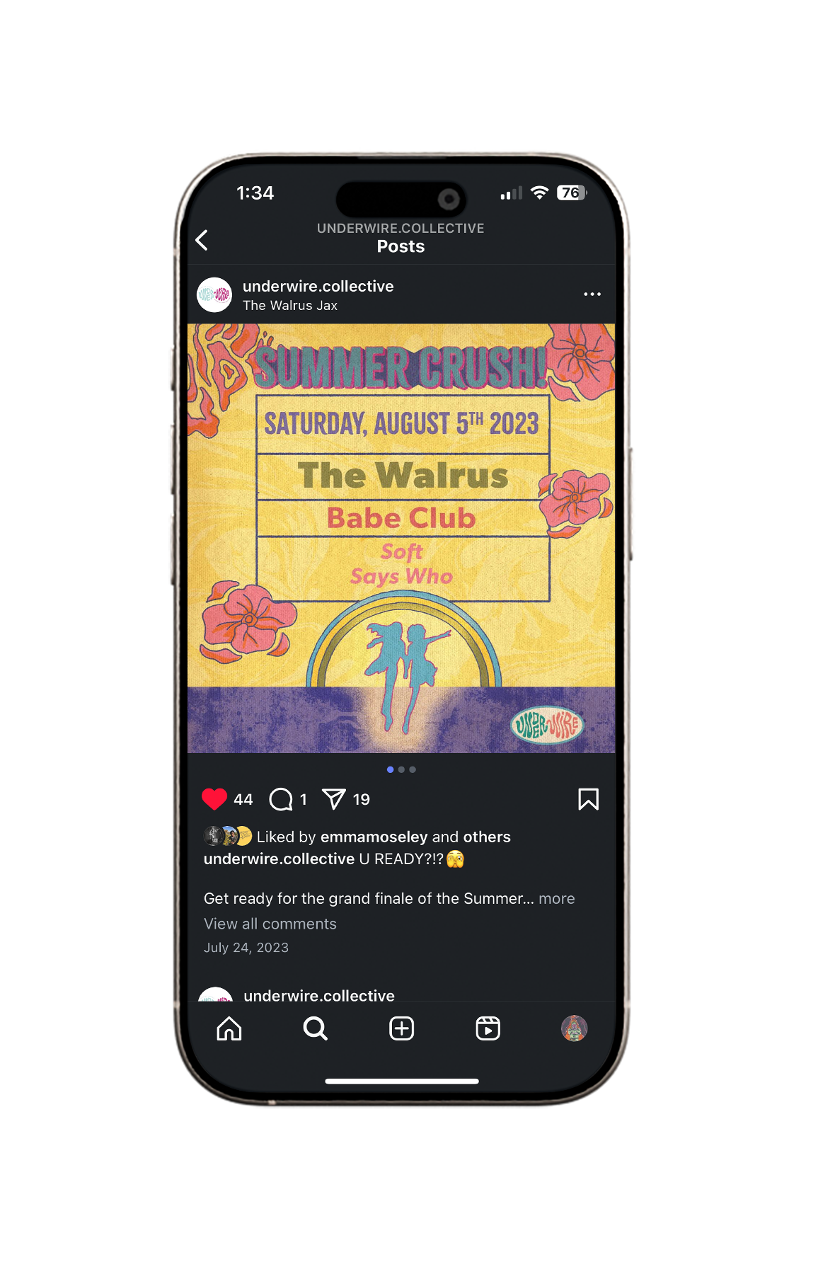 The second Summer Crush poster and branding series I was commissioned to make for Underwire. The 2024 year’s theme was the Olympics, and via the prompt, I was told to use the original Wheaties cereal box branding to base my designs on and reuse the same characters I had drawn for last year’s Summer Crush poster. I started with the large poster, and over two months, I worked with the Underwire team to develop a poster, t-shirts, Instagram posts, a take-home cereal box design, and a few other social media post designs. Overall, I loved working on these two projects, and it was such a delight to be welcomed back on the Underwire team for a little bit.
